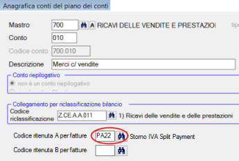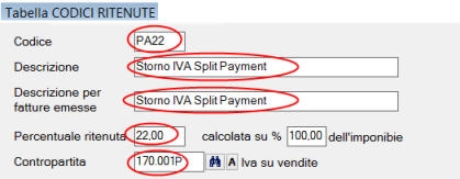 un codice ritenuta PA22: descrizione “Storno IVA split payment”, %ritenuta 22 (oppure 10 o 4 corrisponde all'aliquota iva), conto “170.001P”.
