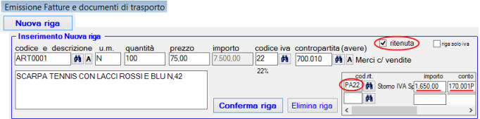 inserendo il codice ritenuta viene automaticamente compilato l'importo (corrispondente all'iva) ed il conto 170.001P