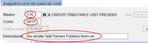un conto nel piano dei conti 170.001P: descrizione “Iva su vendite Pubblica Amministrazione”